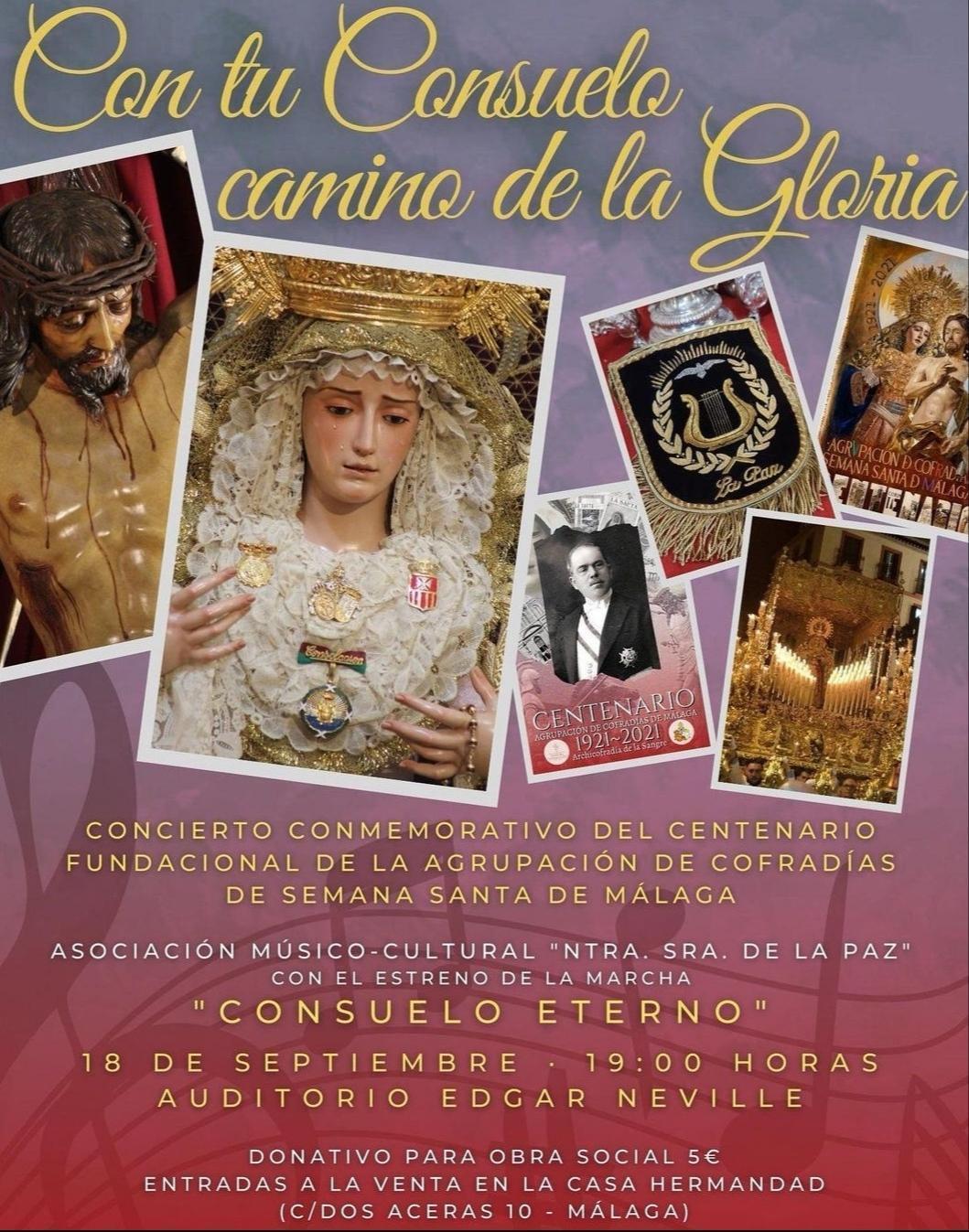 La BM Paz Málaga el próximo 18 de septiembre a las 19h , realizará un concierto de marchas procesionales organizado por la Archicofradía de la Sangre con motivo del centenario de agrupación de Cofradías