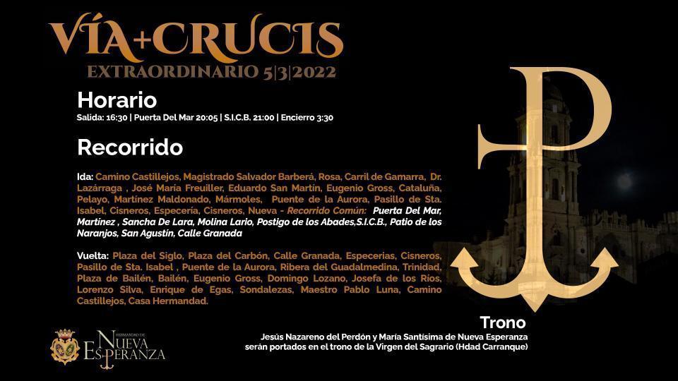 La Hdad de Nueva Esperanza utilizara el pequeño trono de la Virgen del Sagrario de la Pro Hermandad de Verdad y Sagrario para procesionar a sus dos titulares Nazareno del Perdón y la Virgen de Nueva Esperanza para el Viacrucis Magno el dia 5 de marzo. En la foto podeis ver el recorrido.